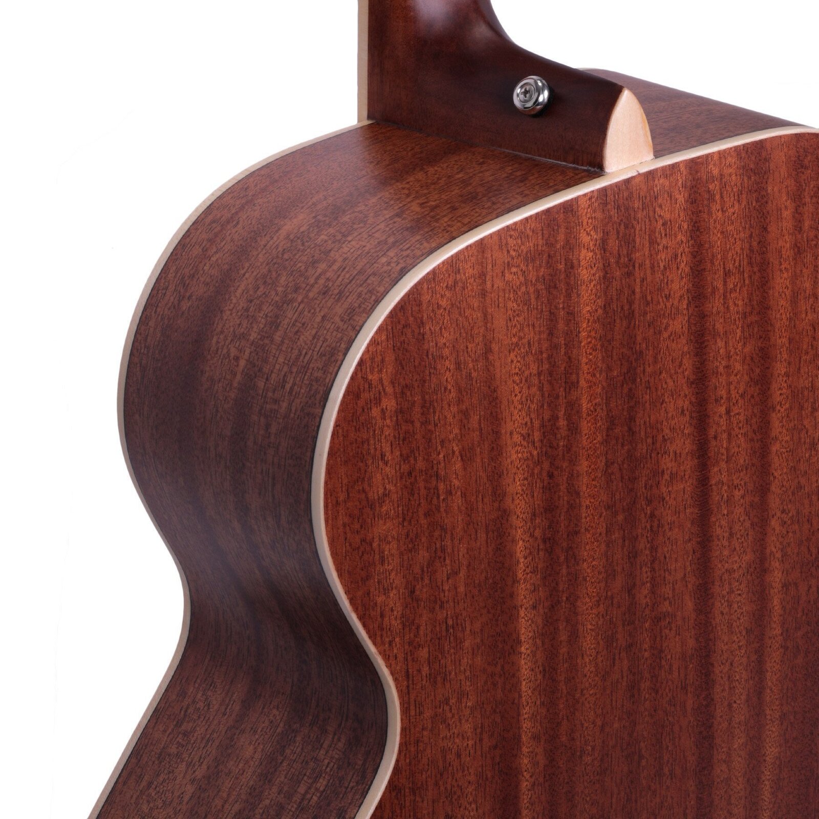 - Solid Spruce top and Solid Mahogany back are braced to maximise vibration.