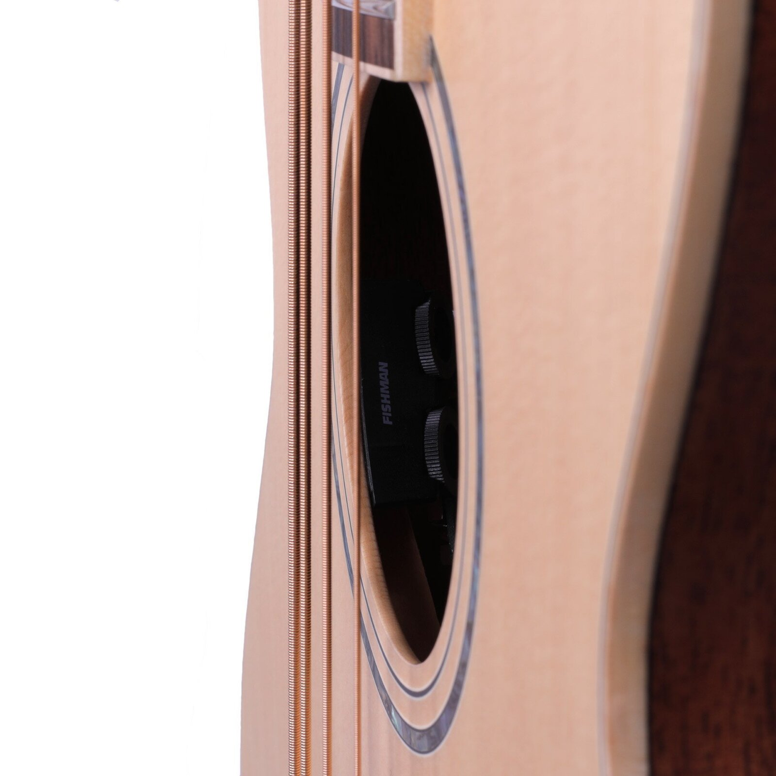 - The Fishman Sonitone pick-up delivers excellent sonic output. The Tone and Volume controls are mounted discreetly inside the sound hole.