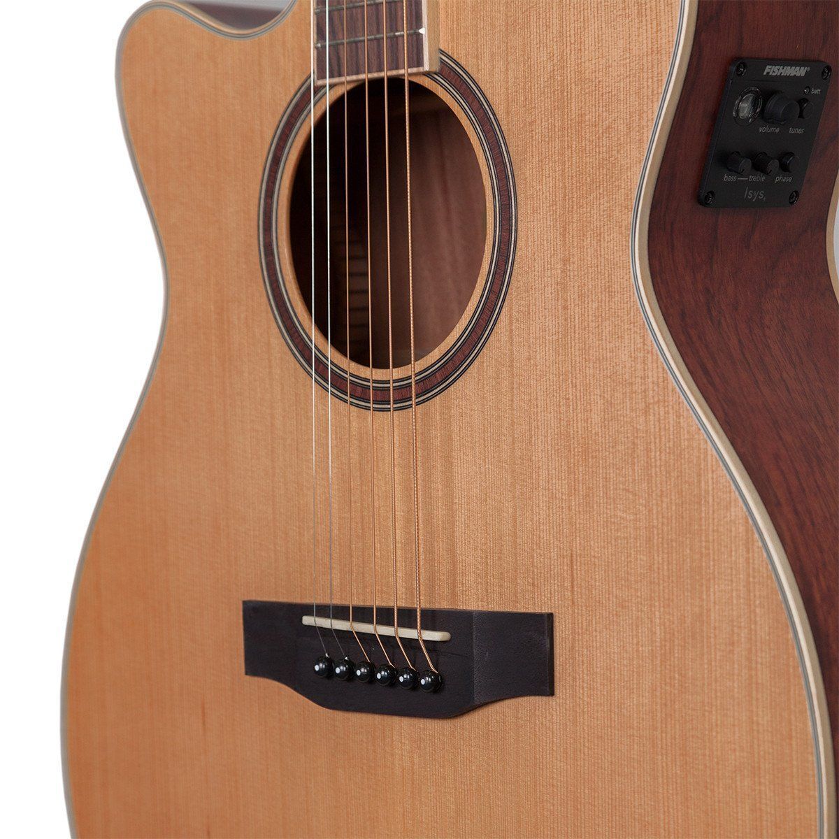 The Timberidge TRFC-4L-NST '4 Series' Left Handed Cedar Solid Top Acoustic-Electric Small Body Cutaway Guitar (Natural Satin) has the impressive tone and projection you expect from a Timberidge guitar and is packed with great features: