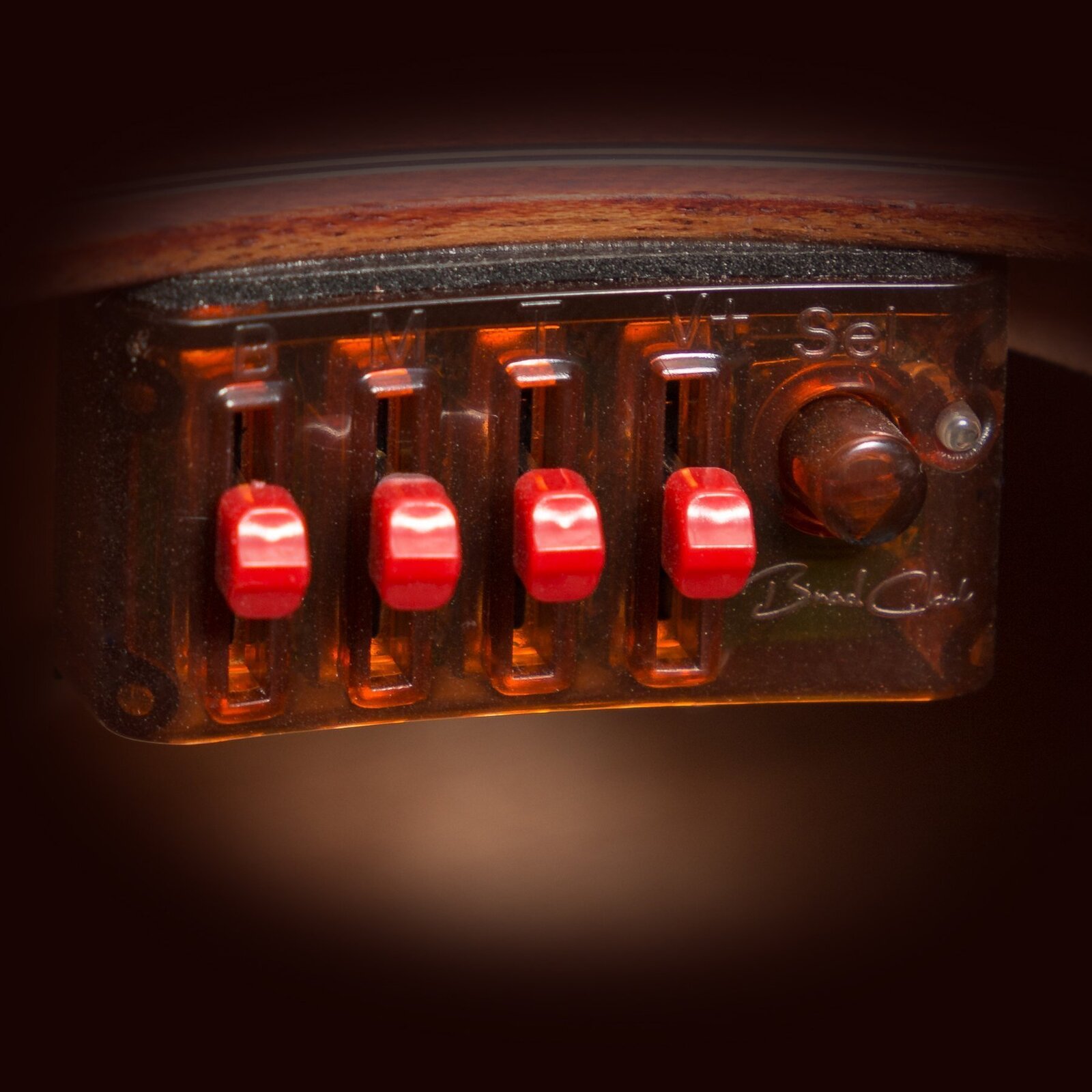 Unlike traditional single piezo pickup systems, the Supernatural pickup utilises six large cylindrical piezos mounted under the bridge plate, allowing the guitars individual “woody” tonal characteristics to be accurately reproduced. Each Supernatural pickup is tuned using specialty EQ filters which take into account the guitars body shape, timbers and finish, resulting in four unique “soundscapes” which users can scroll between with a click of a button.