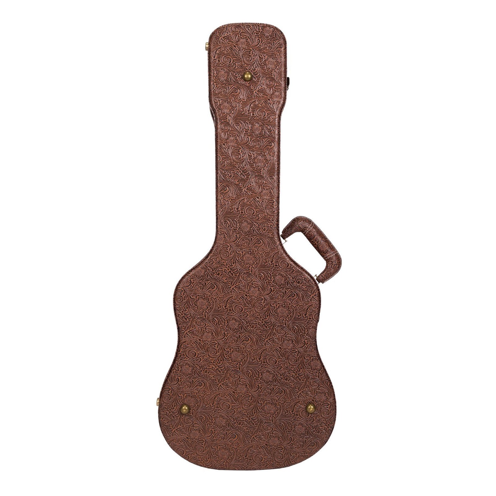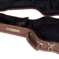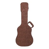 The Timberidge deluxe "Mini" series acoustic guitar case keeps your precious musical investment secure while standing out from the competition with its head turning good looks. Features heavy duty plywood construction with impact resistant reinforced arched top, paisley patterned brown vinyl exterior covering, black plush padded interior, deluxe padded carry handle, accessories compartment, metal feet on base and back, as well as antique finish latches (central latch is lockable).