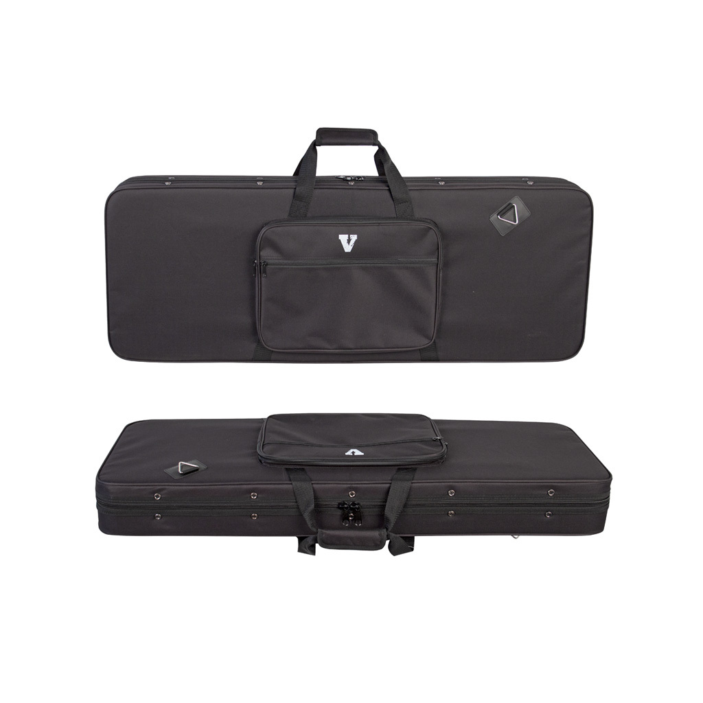 Lightweight moulded polyfoam case covered in black nylon waterproof yarn. Black plush lined interior with 2 accessory compartments. 2 outer accessory pockets. Heavy duty zip. Adjustable shoulder strap with metal clips. Cross stitched, cushioned carry handle. Printed “V” logo. Suits right and left hand guitars.