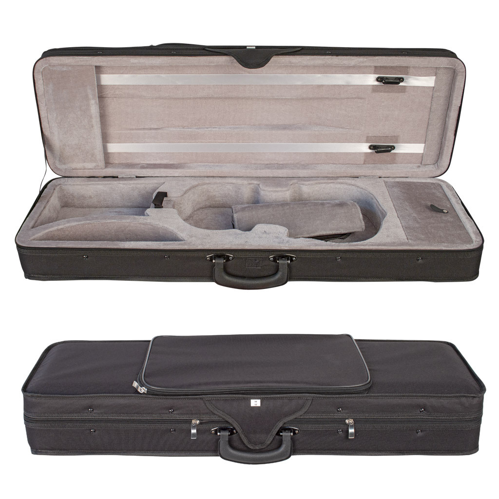 Rectangular. Covered in black nylon waterproof yarn. Grey plush lined with instrument blanket. 2 bow holders, shoulder rest compartment and large accessory compartment with lid. Full length zipper. External accessory pocket. Shoulder strap.