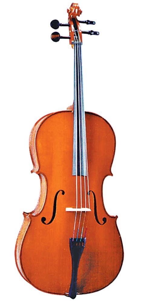Valencia 4/4 size cello outfit. Solid carved top and back. Ebonized fingerboard and pegs. Alloy tailpiece with 4 adjusters. Painted purfling. Wood bow with natural hair. Complete with gig bag and rosin. Traditional chestnut finish.