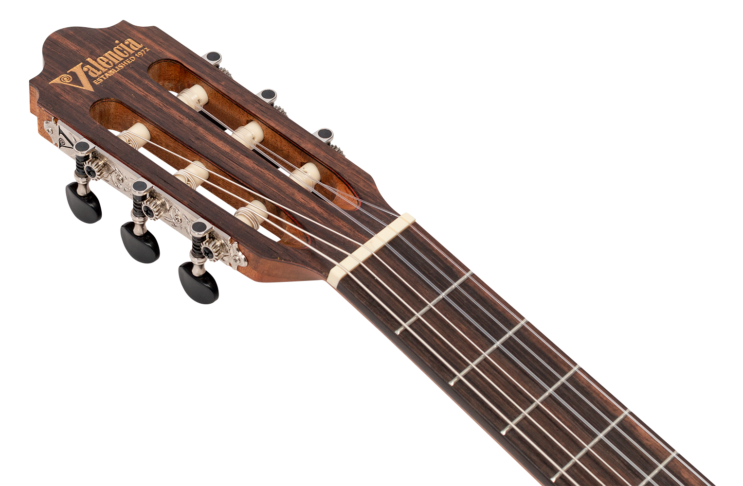 - 3 ply Amara ebony multi veneer headstock with engraved Valencia logo.