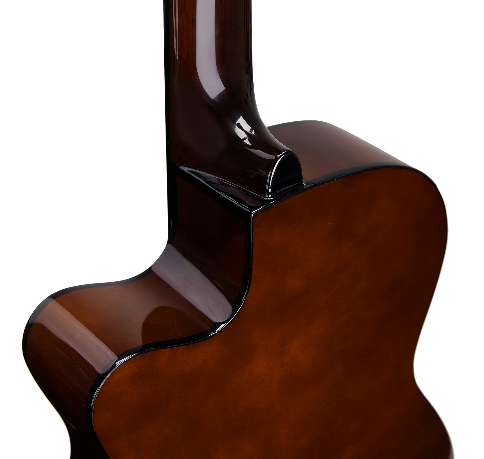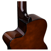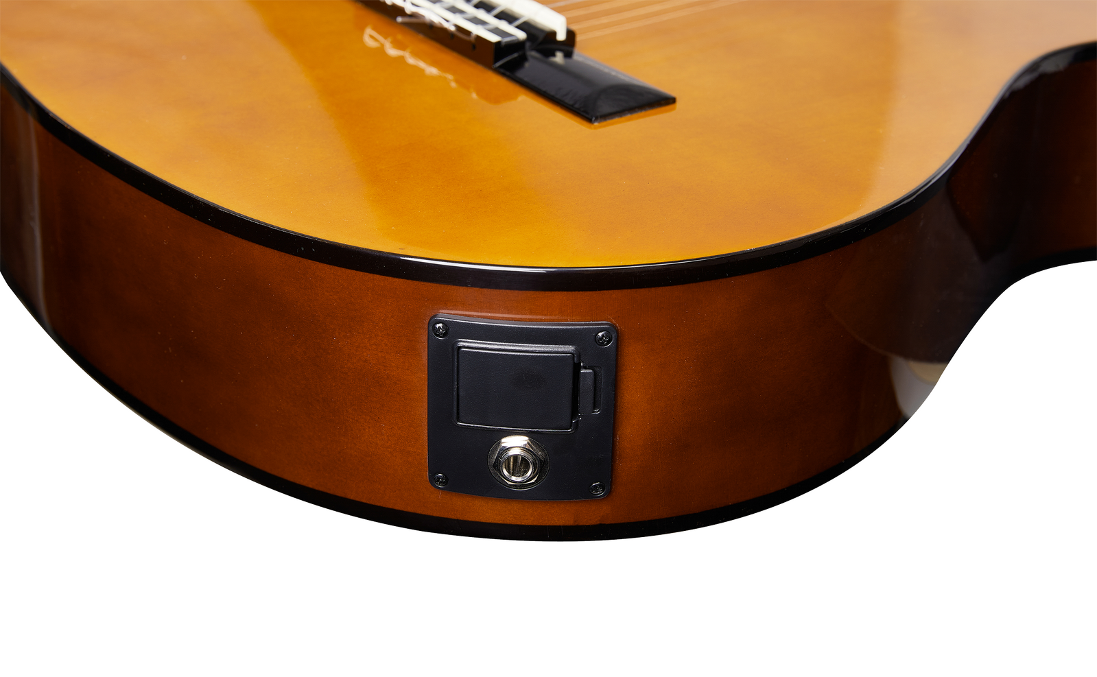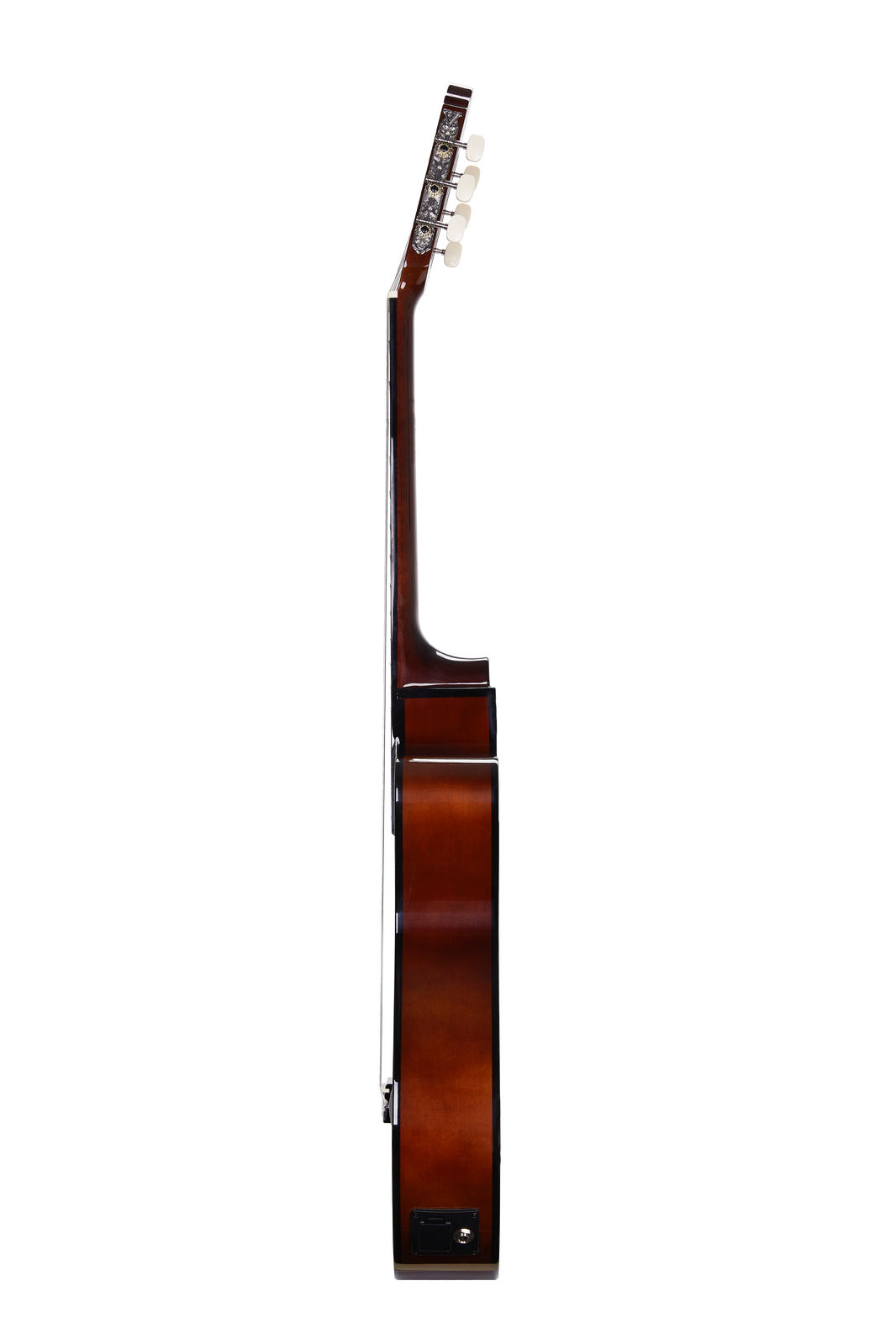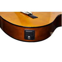 Linden top, back and sides. ABS black bound body and fingerboard. Nato neck with truss rod and ebonized maple fingerboard and bridge. Veneered headstock. Custom nickel machine heads with white buttons. Valencia 4 band EQ preamp with LCD chromatic tuner. Rotary volume, bass, mid, treble and presence controls. Power, note, pitch and phase switches. Low battery LED. 9 volt battery. Piezo under-saddle pickup.