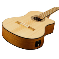 The select Sitka spruce top and bound nato back and sides of the Series 300 range deliver warmth, tone and projection. A mahogany neck coupled with a teak fingerboard and bridge provides a unique look. GraphTech Nu-bone XB bridge saddles and USA strings deliver increased tone, projection and clarity.