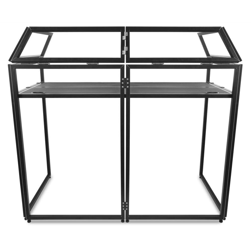 The Vonyx DB3 is a foldable and portable lightweight DJ stand, 1.42 meter wide, and comes with carrying bags for easy transport and storage. It features 4 large panels providing front and sides, and a vented heavy-duty metal shelf which has 2 cut-outs for cables. The feet are adjustable to keep the DJ Booth stable on different surfaces. The stand is a combination of a smart steel construction finished with Lycra fabric that together provides a robust and elegant look. For an extra effect, use a light effect to illuminate and colour the lycra panels from behind. Supplied with a white and black lycra cover.- Foldable perforated DJ-desk attached to DJ-booth