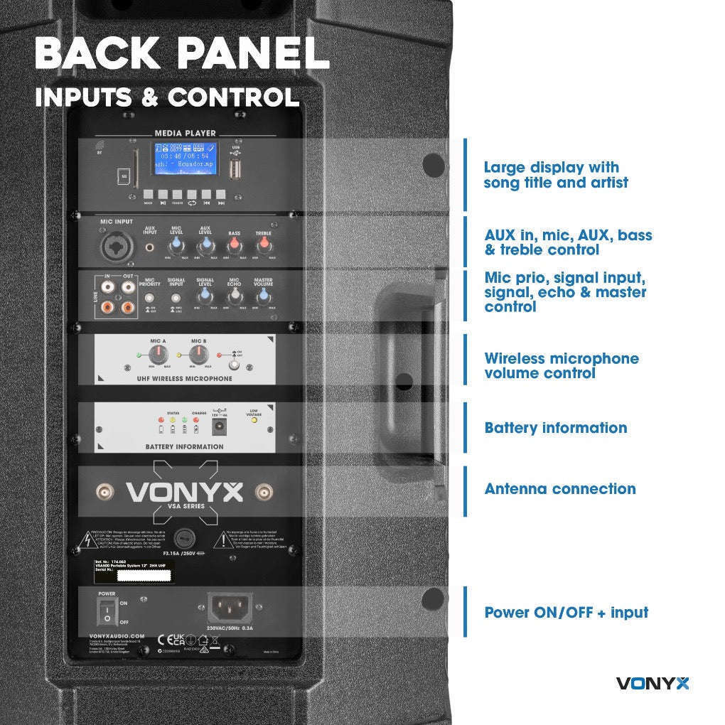 Vonyx VSA500-BP Portable PA 12" Speaker with Wireless HANDHELD -LAPEL HEADSET Microphones