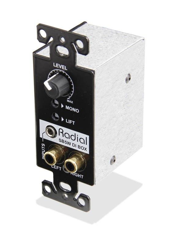 The SB5W is a stereo direct box that fits inside a standard light switch electrical enclosure and employs a Decora wall plate cover for the fit and finish. As the design is completely passive, no local powering is needed. Choice of RCA or 3.5mm mini TRS inputs make it easy to interface to laptops and iPhones. A simple level control sets the output. This is augmented with a set & forget switch to sum the stereo audio file to mono plus a ground lift to eliminate hum and buzz caused by ground loops that often appear when interfacing computers and video projectors with professional audio equipment. Connections from the SB5W are done with simple screw-down terminals and tie wraps for strain relief