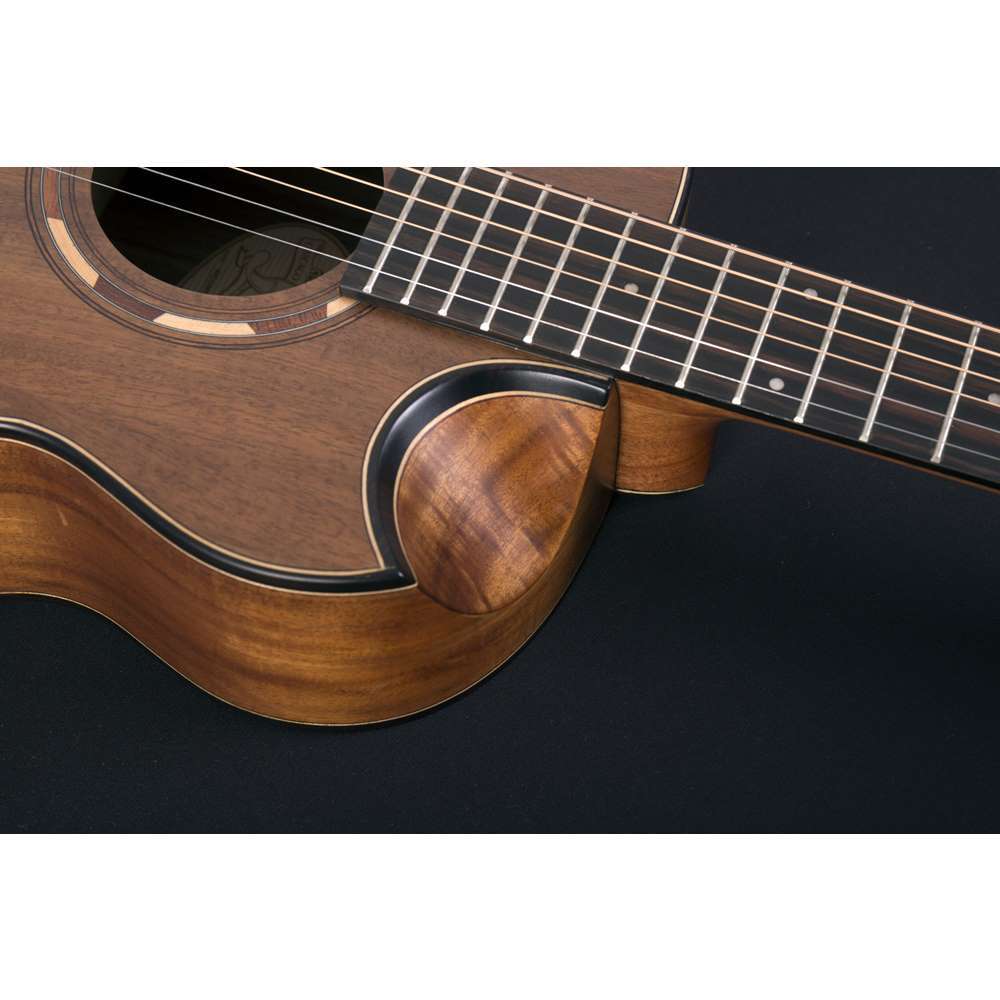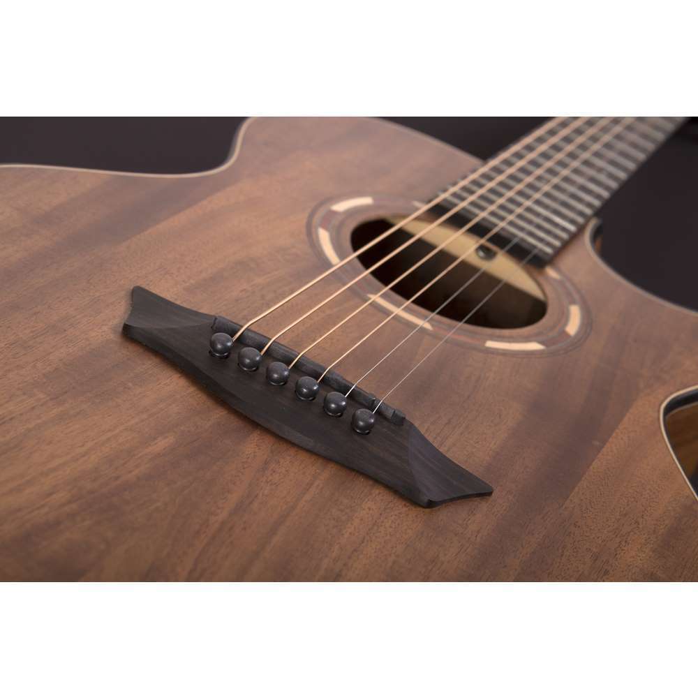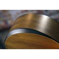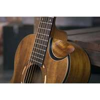 Washburn’s Comfort Series all consider ergonomic solutions to make the playing experience more comfortable. The Comfort G-Mini 55 Koa is a 7/8 size, satin finished, “Mini” Grand Auditorium body acoustic guitar with a Koa top, back and sides. Bound in Walnut, it features a rounded over “Binding Relief” underneath the player’s forearm area and a “Comfort Carve-Away” at the upper shoulder which allows for superior access to the higher frets. The mahogany neck has a ebony fingerboard with dot inlays which ties in nicely with the ebony bridge. The headstock features a maple Washburn logo as well as gold tuners with ebonite buttons. The gorgeous parquet rosette is made of alternating maple and mahogany.