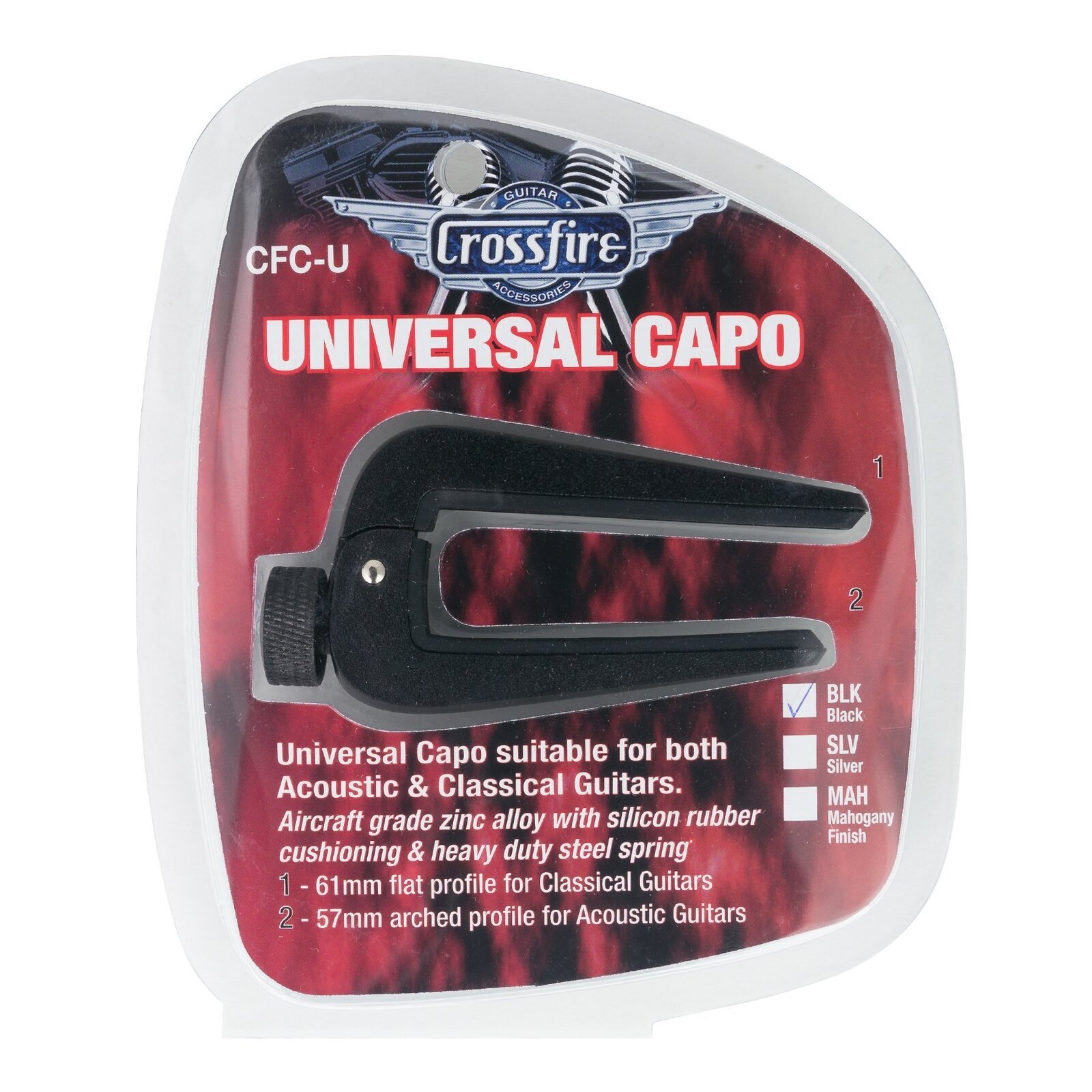 The Crossfire universal capo is suitable for both acoustic steel and nylon string guitars thanks to its clever double sided design; incorporating a 61 mm flat profile for classical guitars, and a 57 mm arched profile for steel string acoustic guitars.