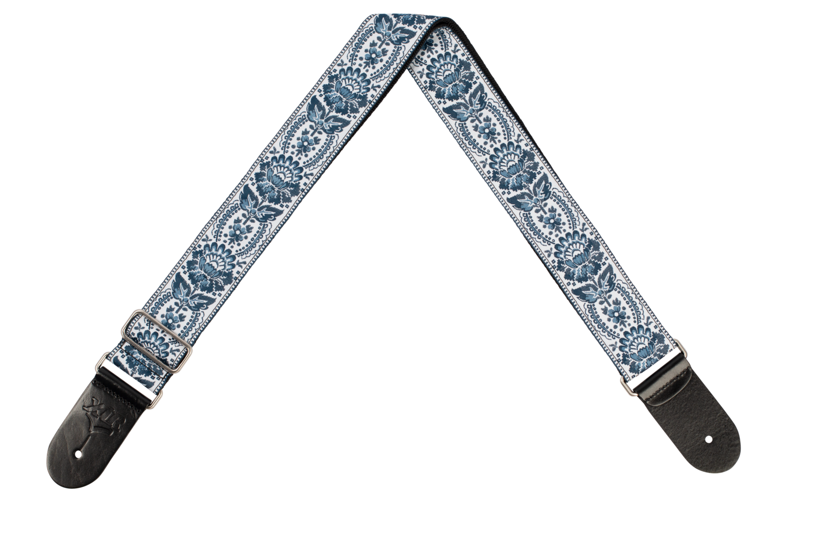 XTR - 2 inch deluxe woven jacquard poly cotton strap with comfortable, two layer black poly backing. Premium black leather ends, smooth chrome slider adjustment. XTR display hanger. Floral blue/white pattern.