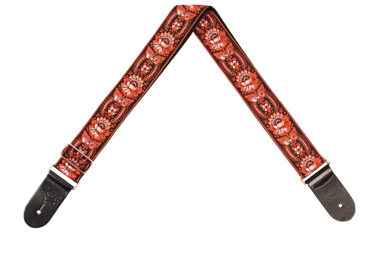 XTR 2" deluxe woven jacquard poly cotton strap with comfortable, two layer black poly backing. Premium black leather ends, smooth chrome slider adjustment. XTR display hanger. Floral red/black pattern.