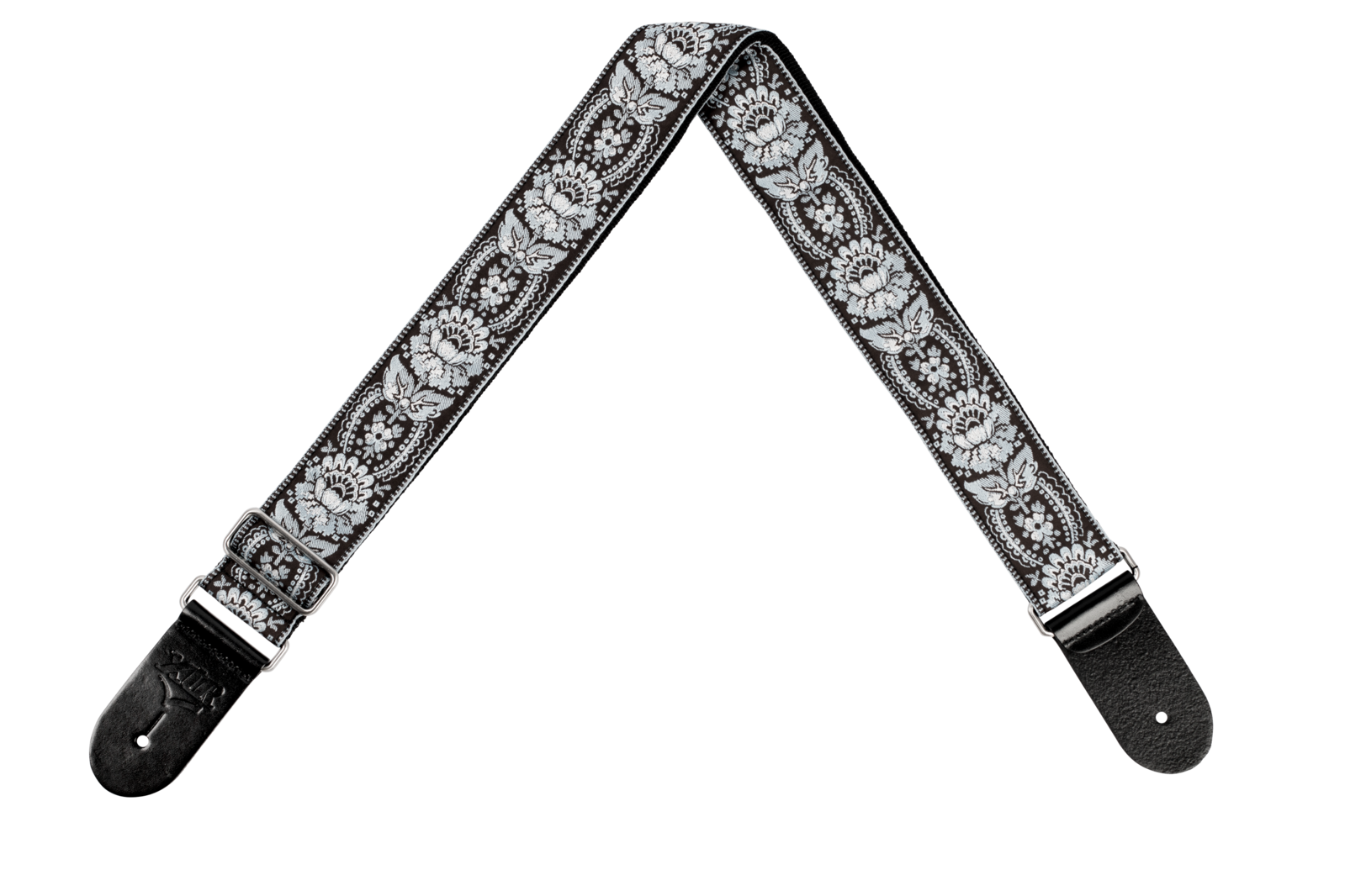 XTR 2" deluxe woven jacquard poly cotton strap with comfortable, two layer black poly backing. Premium black leather ends, smooth chrome slider adjustment. Floral Silver/Black pattern.