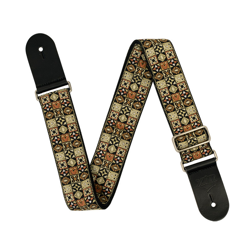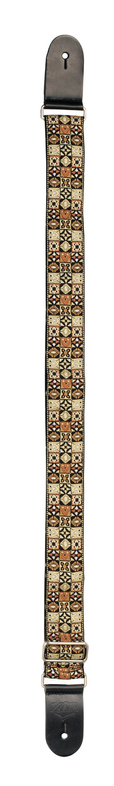 2 inch deluxe woven jacquard poly cotton strap with comfortable, two layer black poly backing. Premium black leather ends, smooth chrome slider adjustment. XTR display hanger. 60's brown pattern.