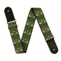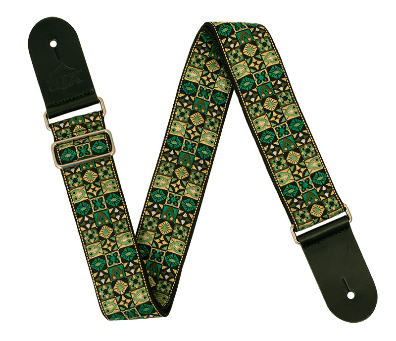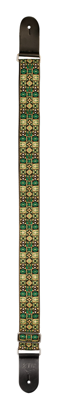 2 inch deluxe woven jacquard poly cotton strap with comfortable, two layer black poly backing. Premium black leather ends, smooth chrome slider adjustment. XTR display hanger. 60's green pattern.