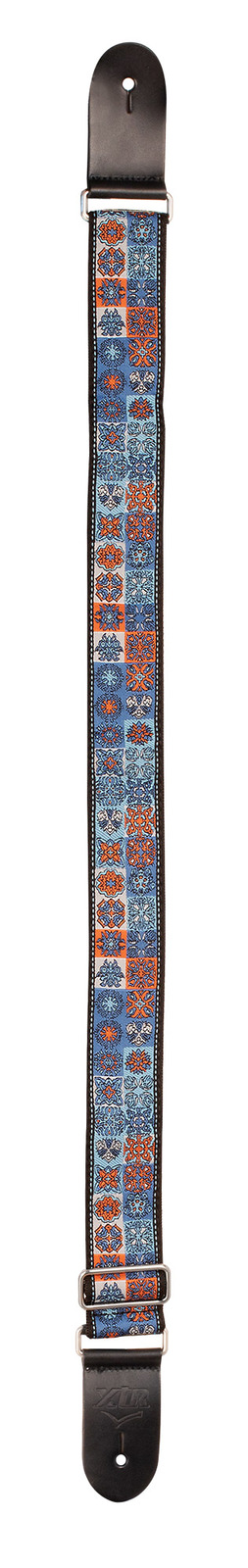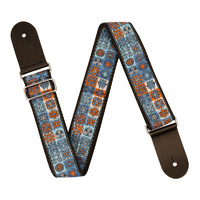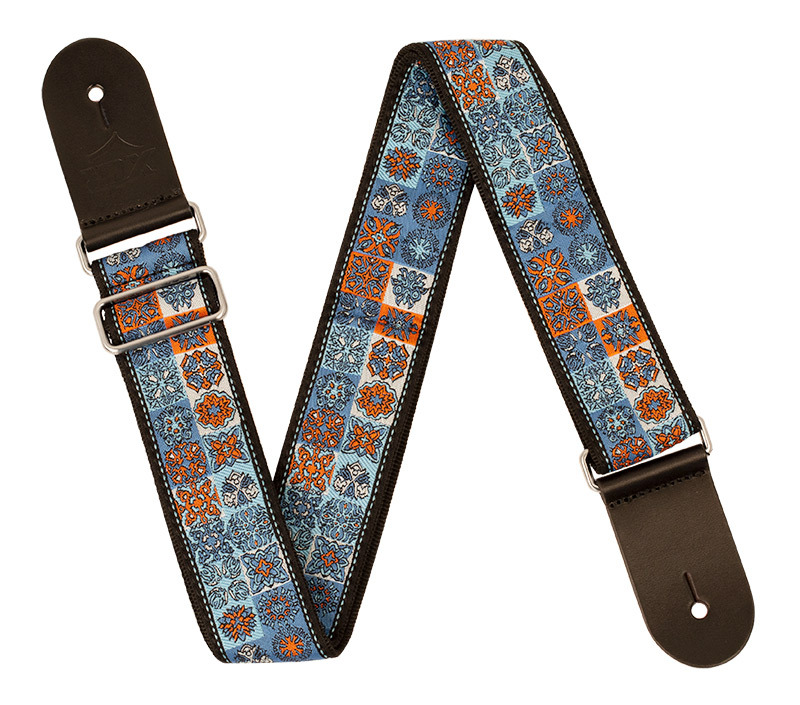 2 inch deluxe woven jacquard poly cotton strap with comfortable, two layer black poly backing. Premium black leather ends, smooth chrome slide adjustment. XTR display hanger. Vintage light blue pattern.