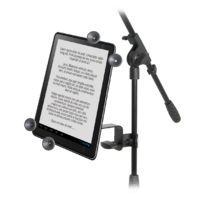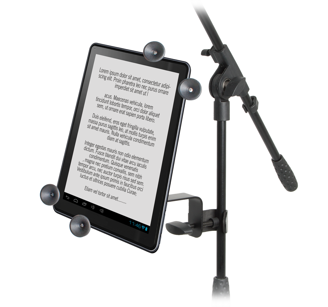 • Bracket and clamp attached to mic stand and secures the tablet for easy access and viewing