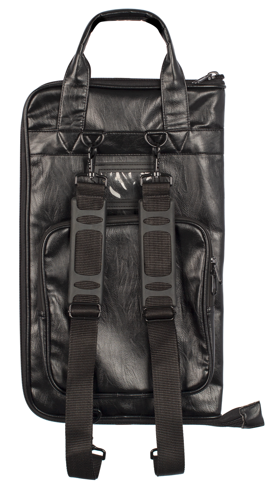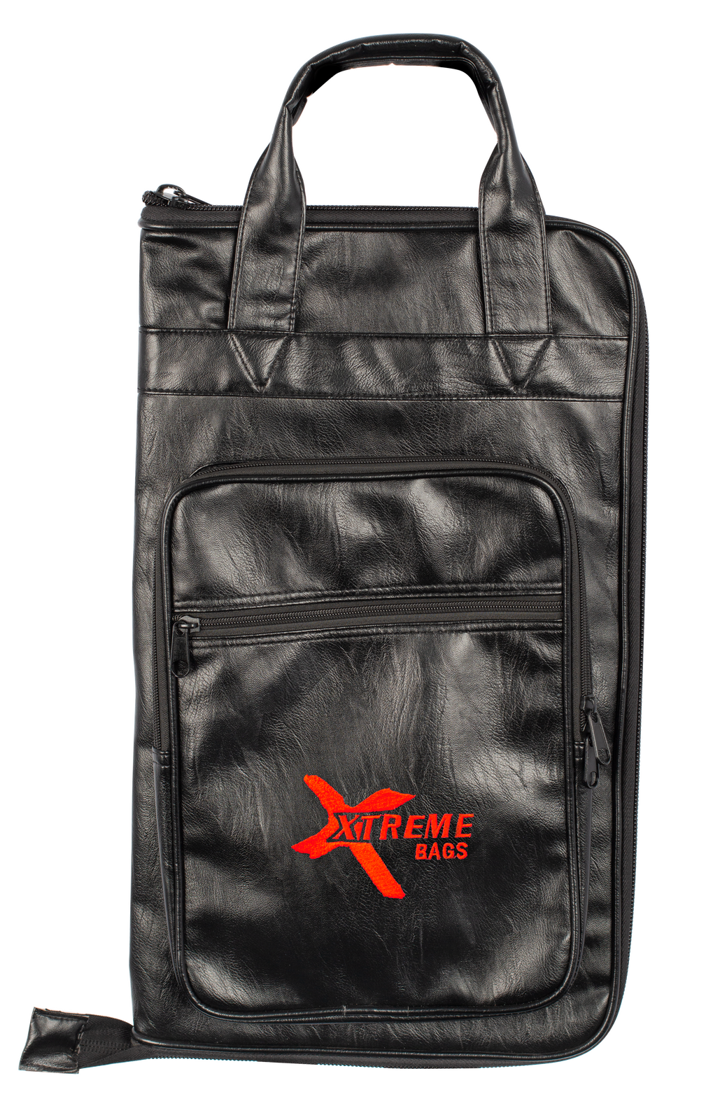 Soft black synthetic leather material. Adjustable hanging straps with metal hooks. 2 padded carry handles and 2 adjustable, removable shoulder straps with heavy duty metal clips and rings. 3 large exterior accessory pockets, perfect to fit A4 pad, tablet and 8” practice pad. Carabiner hook to hang keys. Name tag/card holder. Embroidered Xtreme logo.