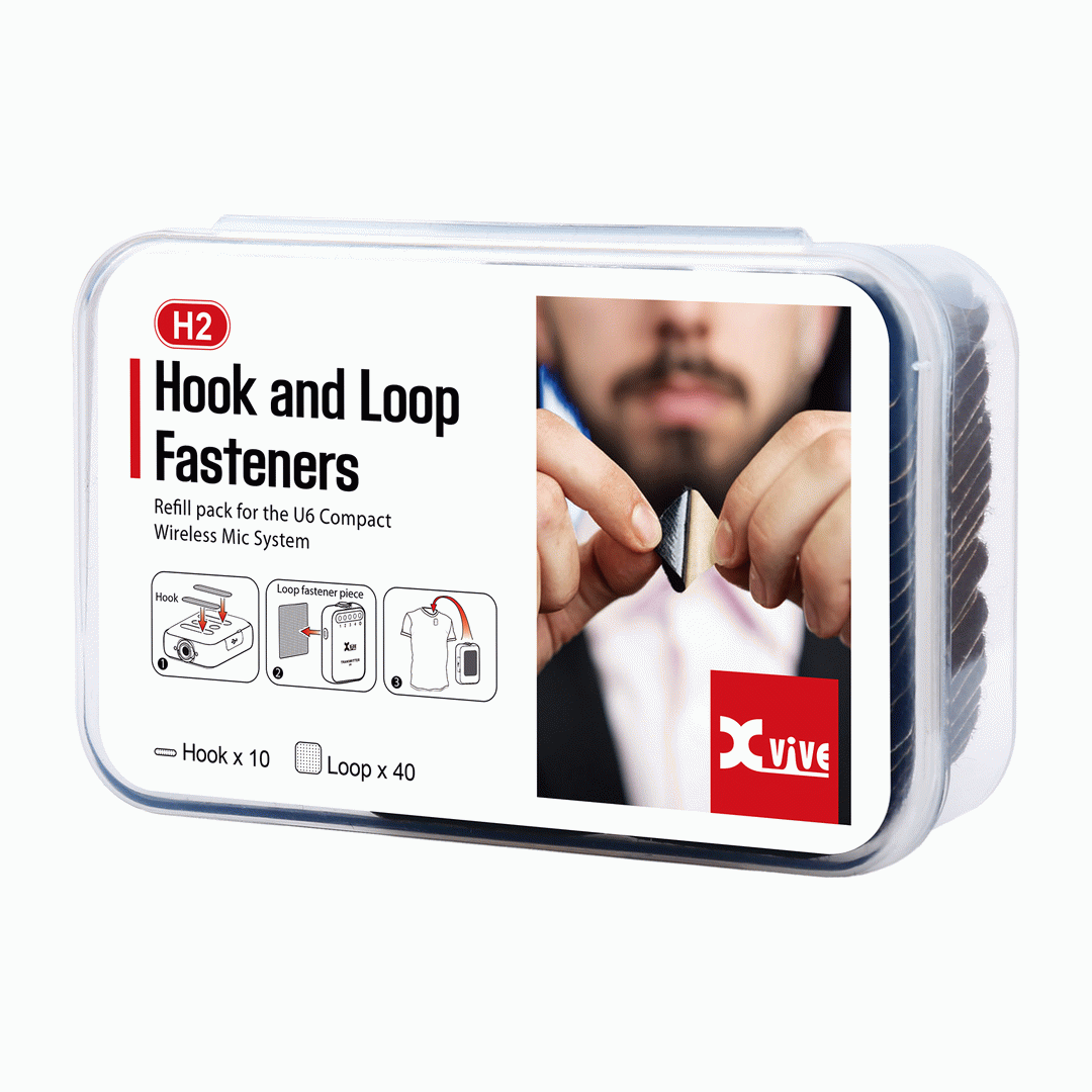 The H2 Hook and Loop Fasteners Refill pack for the U6 Compact Wireless Mic System Mounting the Xvive U6 transmitter using the H2 hook and loop fasteners is super-versatile. Attach the U6 to clothing, hats, glass surfaces, plastic or wood, and much more! The hook and loop pieces are reusable and will last many times - great to pair with the Xvive U6.