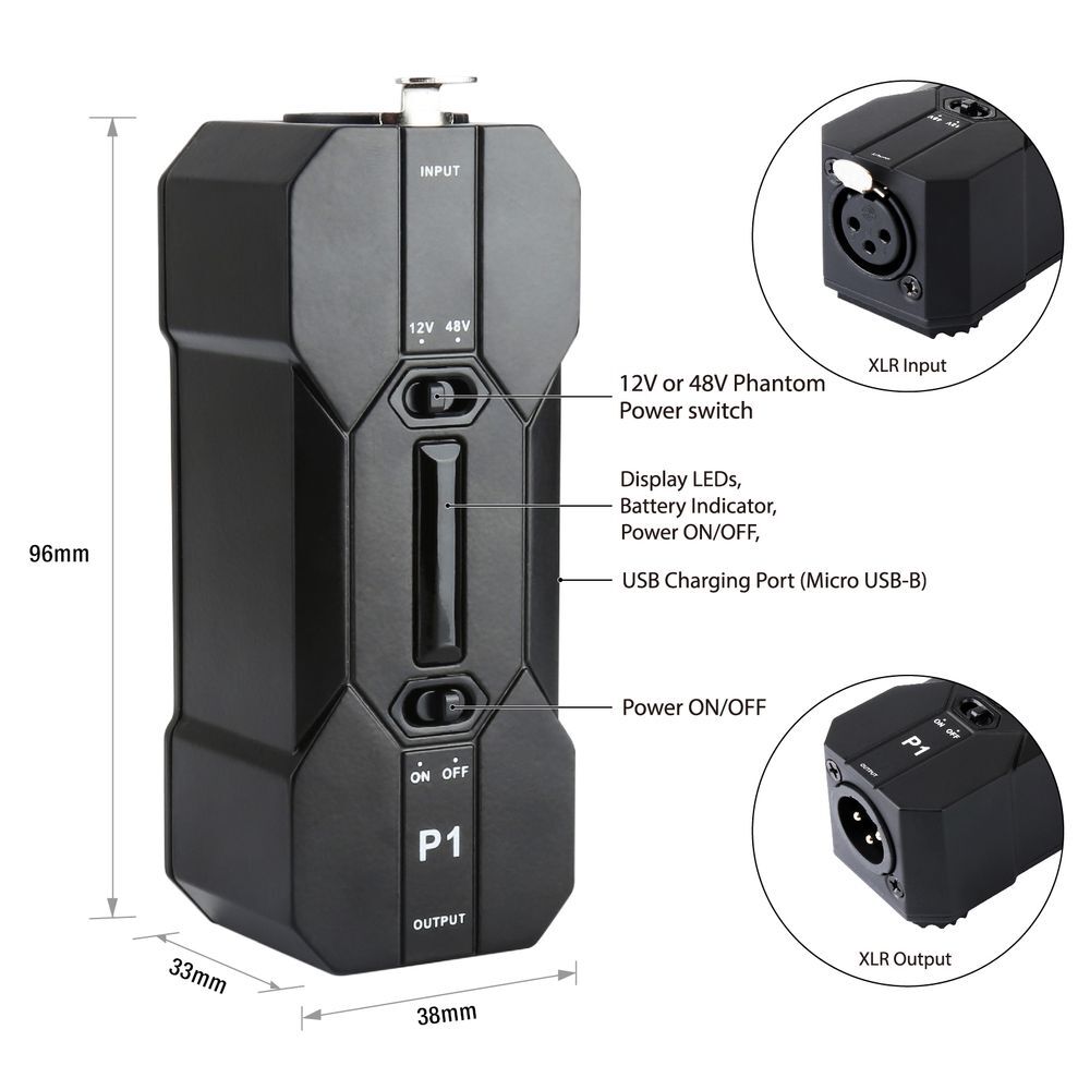 The Xvive P1 Portable Phantom Power Supply is a low-noise, 12V / 48V power supply. It runs on an internal rechargeable battery and has enough power to run high-current microphones. The P1 allows you to use microphones and devices that require external power in any setup. The small size, light weight, rugged construction, and exceptionally low noise of the P1 makes it perfect for powering microphones to send a signal to mixing consoles, or any type of processor or recording unit, that does not supply phantom power . Long battery life and a bright LED battery indicator ensure that the microphone is properly powered throughout your recording session.