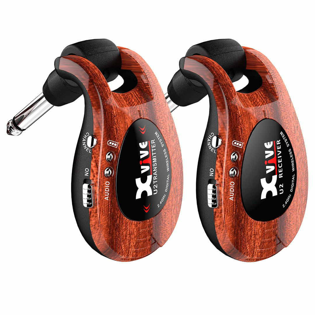 The Xvive U2 system offers four channel choices at 2.4 GHz, and up to 100ft line-of-sight range. You can use up to 4 sets of transmitters and receivers with multiple instruments in the same setting, or you can assign multiple receivers to the same channel and use a single transmitter. Up to 100ft/30 metre line-of-sight transmission range Frequency Response: 10Hz-20kHz -Delay time: <6ms Resolution: 24-bit Delta Sigma, 2.4GHz broadcast A/D conversion: 24-bit low-noise system Play Time: Approx. 5 hours Recharge Time: Approx. 2 hours Input/Output: Side-mounted 1/4-inch Jack connector Use with any Hi-Z 1/4-inch instrument output Colour: Wood