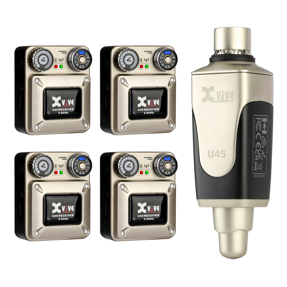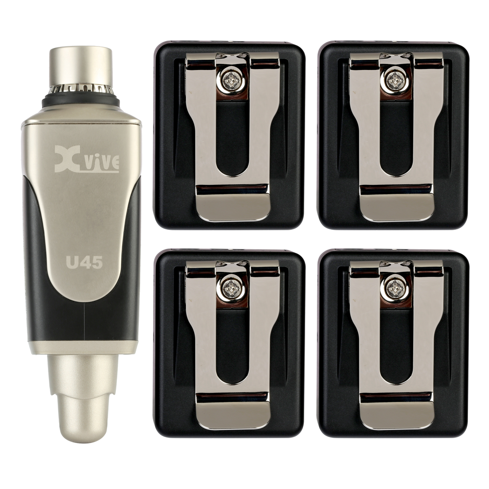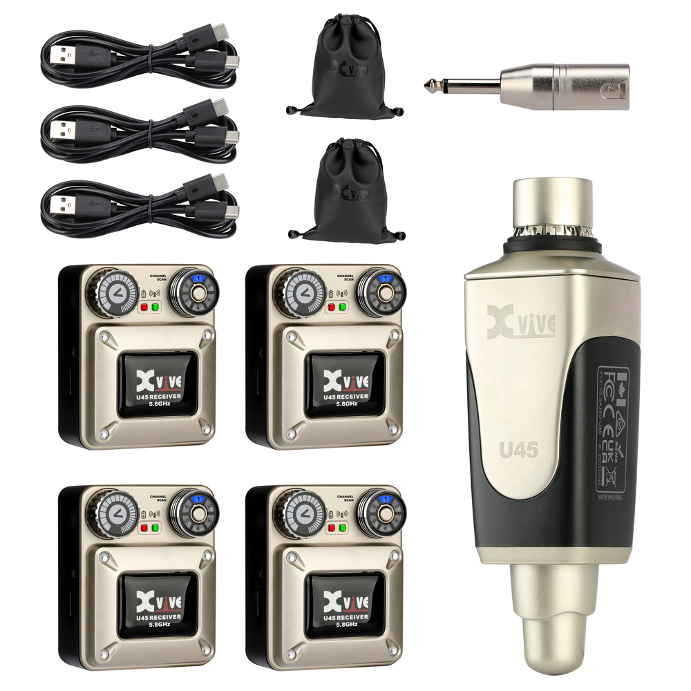 The Xvive U45T9 Complete 5.8 GHz In Ear Monitor System comprises of the U45 Transmitter and four U45 belt pack recievers.