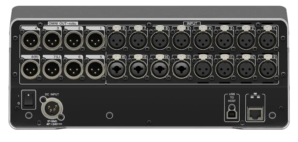 - Local I/O: 16 Mic/Line (12 XLR + 4 XLR/TRS Phones Combo) inputs, and 8 (XLR) outputs