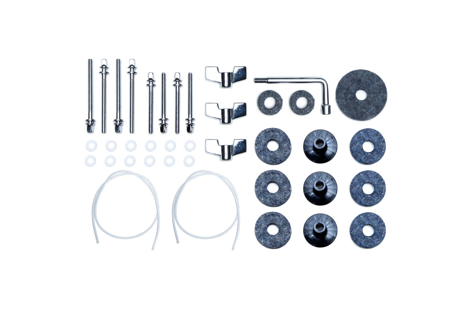 The Drummer's survival kit contains all the emergency items that drummers need at the gig. There are 6 cymbal felts, 3 cymbal sleeves, 2 HiHat clutch felts, 1 HiHat cup felt, 3 8mm wing nuts, 8 tension rods (4 Floor Tom and 4 Snare Drum), 12 nylon washers, drum key and 2 snare wire cords.