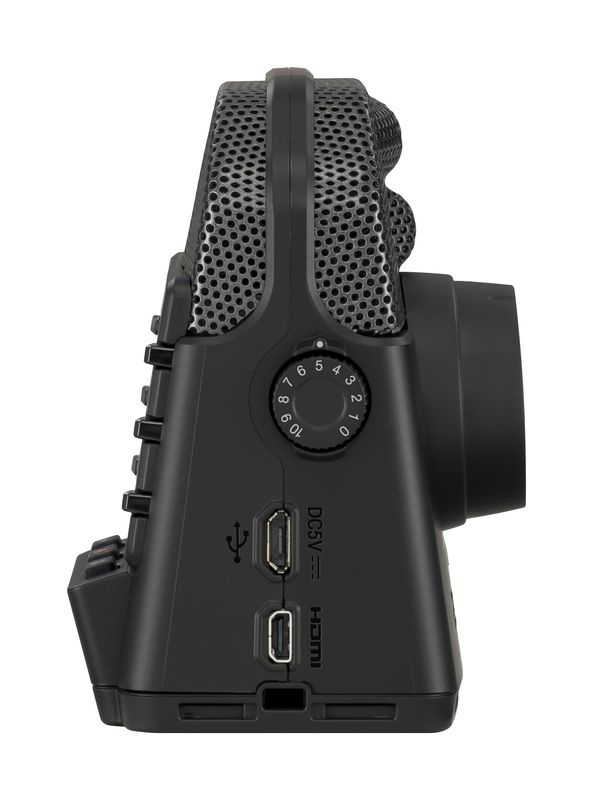 The Q2n-4K's stereo condenser mics are arranged in an X/Y pattern and can handle sound pressure levels up to 120 dB, standing up to even loud rock stages. An audio-only mode records standalone WAV files up to 24-bit/96 kHz. Audio functions include auto gain, a low-cut filter, a 3.5mm line-in/mic-in port, and a headphone output.