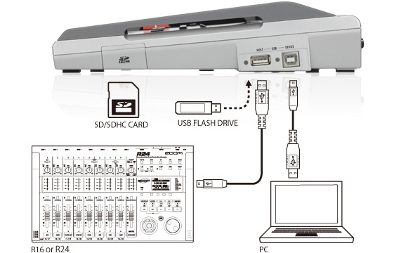 The R24 can be used as a control surface for DAW transport functions (play, record, stop) and mixing operations. You can easily move multiple faders at the same time, which is very difficult to do with a mouse! You can also assign the five function keys to various DAW software commands. Cubase, Logic, Sonar and other major DAW applications are supported in Mackie Control emulation mode.