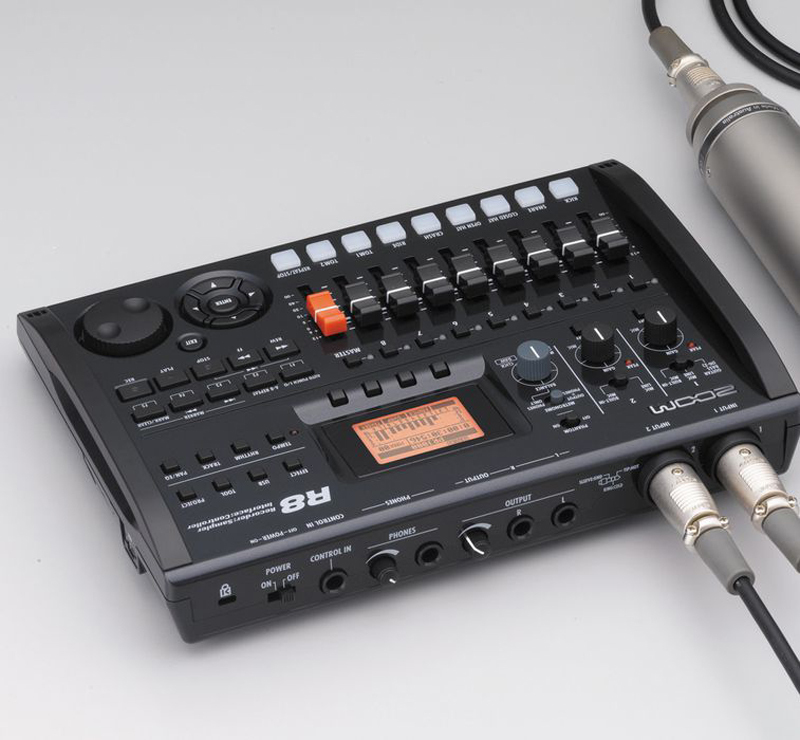 The R8's sampler function consists of eight voices triggered by eight built-in pads. Samples can also be assigned to each pad to create loops. It also has internal drum loops, which allow you to easily create pro-quality backing and basic tracks. Not only does the R8 offer over 500 drum patterns to work with, it also includes a 2GB SD card containing 500MB of drum loops recorded by Big Fish Audio.