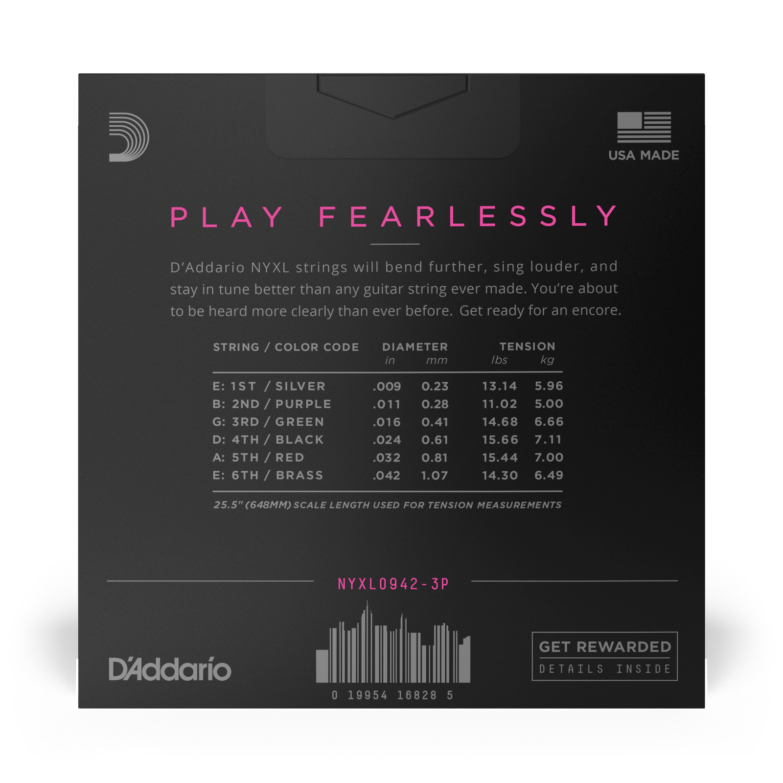 D'Addario offers 3 sets of strings in one convenient, cost-effective & environmentally friendly multipack. Each set is packaged in separate VCI bags for corrosion resistance, so they're fresh when you're ready to restring.DAddario NYXL guitar strings will bend further, sing louder, and stay in tune better than any string youve played before. Envisioned, perfected, and manufactured by DAddario in New York, this newly engineered, break-resistant, high-carbon steel core and plain steel alloy delivers a whole new level of freedom, confidence, and power. NYXLs provide more strength and up to 131% greater tuning stability by utilizing a completely reinvented wire drawing process coupled with a revolutionary fusion twist process for the plain steels. The reformulated nickel-plated string windings have greater magnetic properties resulting in higher output and enhanced mid-range frequency response for more presence and crunch.