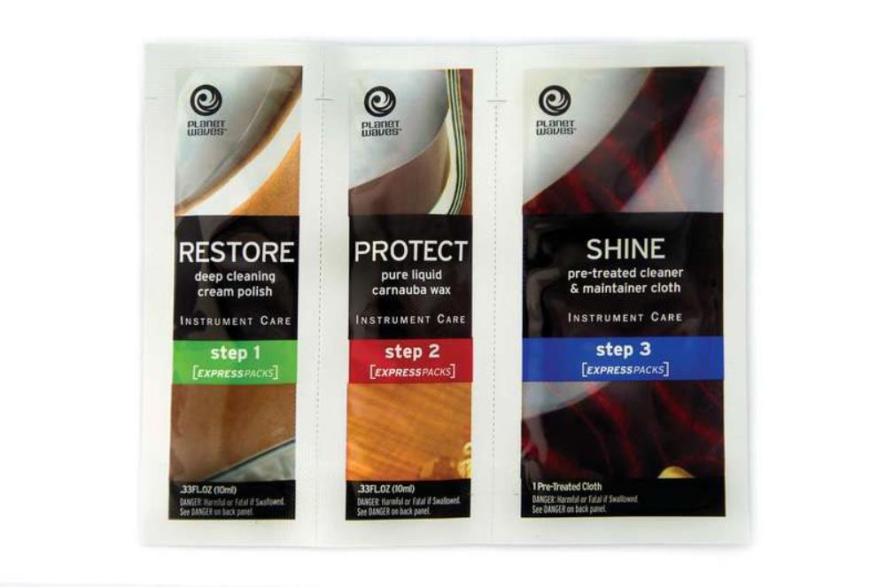 Planet Waves Express Packs are the Ultimate one-time use 3 step polishing system for guitar and basses. Each Express packet contains a one-time use quantity of each polish in the 3-step detailing system that includes Restore, Protect and Shine. Restore cuts through the toughest grime to polish out swirl marks and even minor scratches. Protect is a natural protectant and sealer combining premium quality Brazilian carnauba and advanced chemistry to produce a distinct radiance. Finally, as the name implies, Shine provides one more level of glossy beauty.