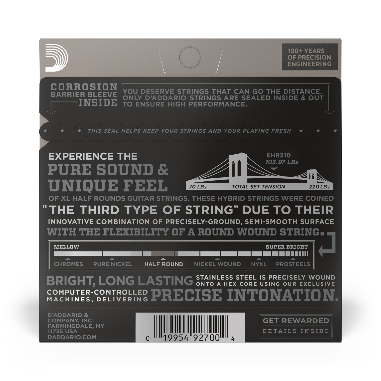 Coined the third type of string, XL Half Rounds are an innovative combination of round wound and flat wound strings. Half Rounds electric guitar strings have a smoother feel than round wound strings, but a fuller tone than strings which are flat wound. Made with a high carbon steel core and stainless steel wrap wire, theyre finished with a precision grinding process to provide a smooth feel and reduced finger noise, with tone that's comparable to round wound strings. 10-46 Regular Light strings are our most popular gauge, providing a nice balance of tone and playability.D'Addario Half Rounds electric guitar strings are round wound with stainless steel, then precision ground, leaving the outer surface smooth and semi-flat. The result is a string with the tone and tension of round wound strings, plus a smoother feel, like that of flat wound.