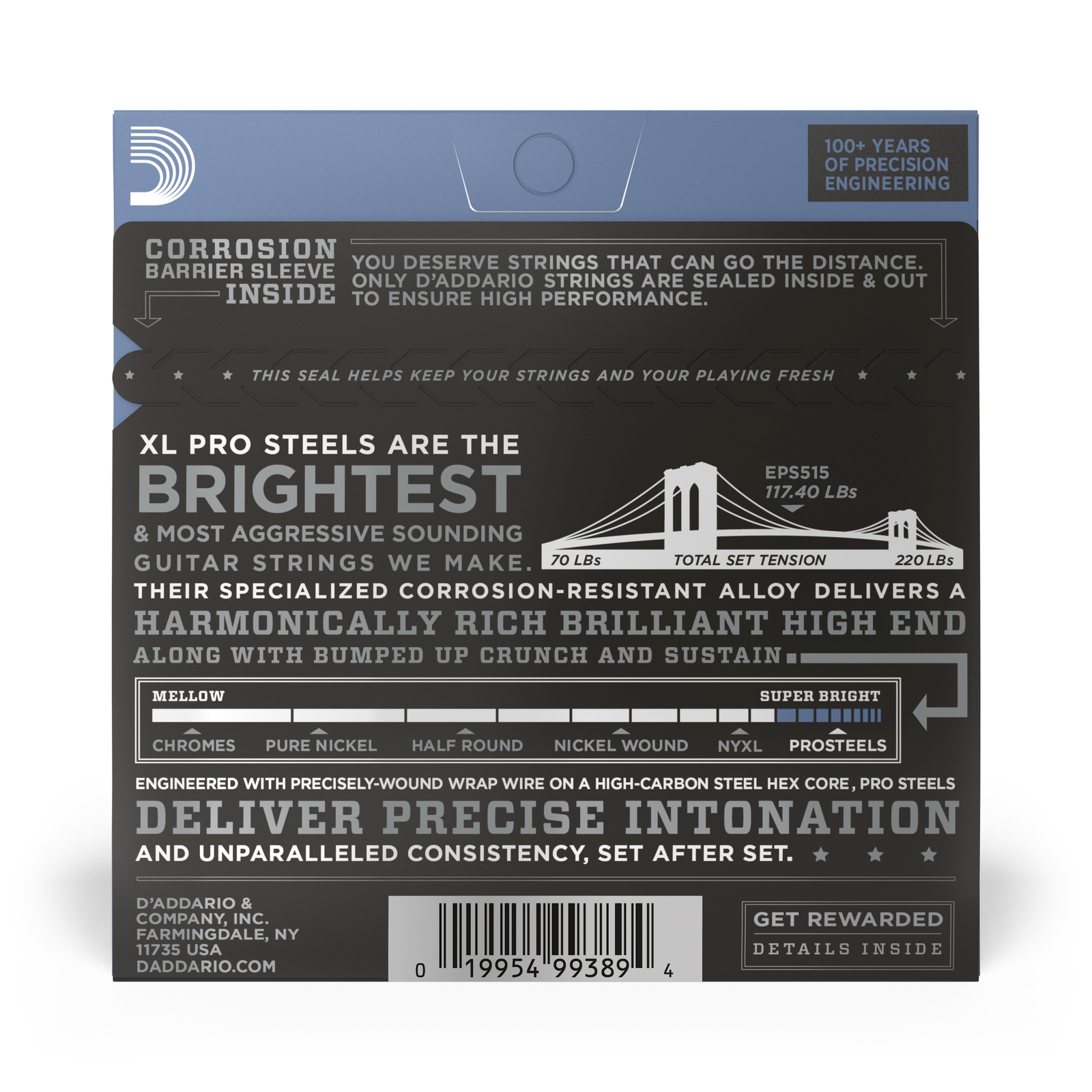 XL ProSteels are DAddarios brightest electric guitar strings. The unique, highly magnetic alloy in ProSteels offers a super bright, crunchy tone, and increased sustain. Made with a high carbon steel core and stainless steel wrap wire, ProSteels produce enhanced interaction with magnetic pickups, creating an extraordinarily bright tone that will cut through any mix. These 11-50 Medium gauge strings provide increased volume, with slightly more tension and resistance.D'Addario XL ProSteels utilize a highly magnetic, corrosion-resistant steel alloy that delivers super-bright tone. They offer a palette of harmonically rich, brilliantly penetrating highs combined with pronounced, tight-and-tough lows. If you're looking for more crunch, bite, and sustain, ProSteels are the choice for you.